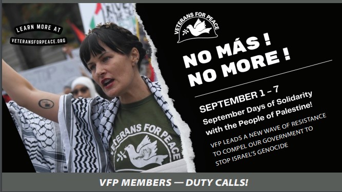 Specifically, during “September Days of Solidarity with the People of Palestine,” we call on all VFP members and chapters across the U.S. to commit to organize with our allies, the following three actions from September 1 through 7: